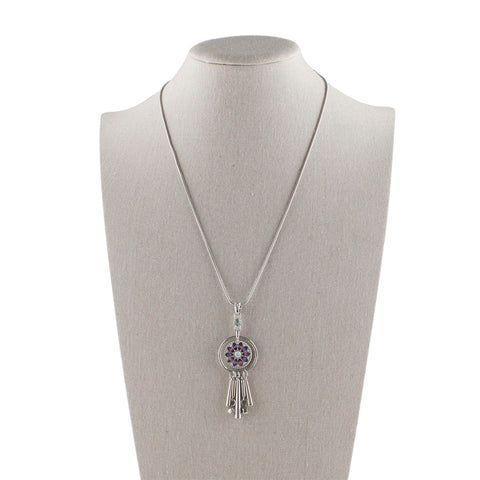 A nicely detailed pendant a silver finish sporting two sparkling rhinestones.
